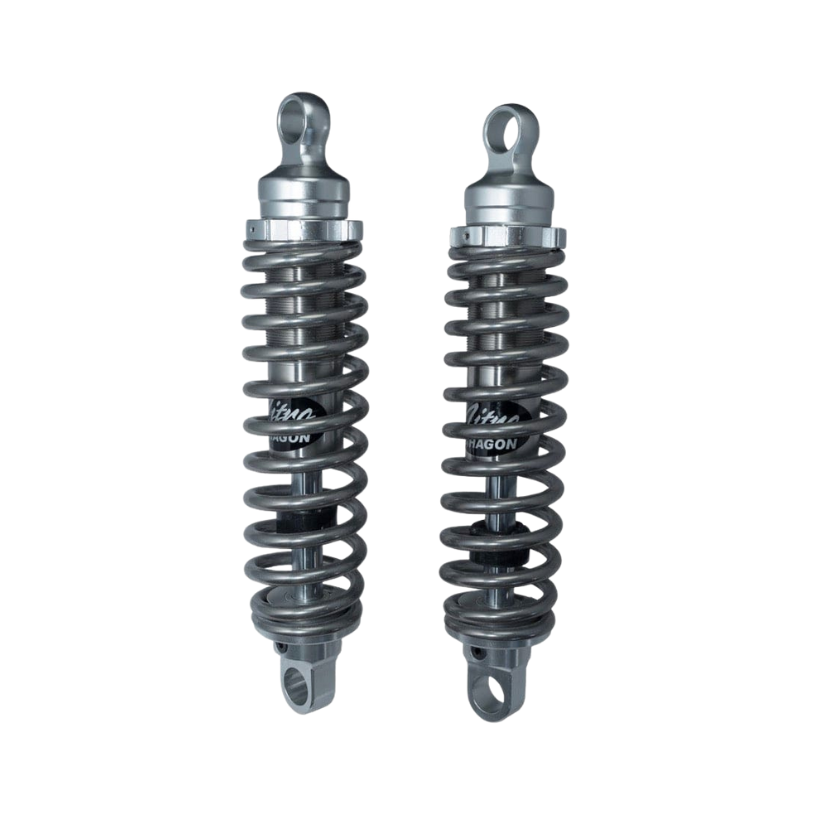 De Hagon nitro series, uitgevoerd uit de meest hoogwaardige materialen zoals rvs dempers, rvs veer en aluminium geanodiseerde stelringen. Deze progressieve demper is zowel hydraulisch als mechanisch instelbaar. Geleverd als complete set, inclusief montagebussen en de juiste stelsleutels. De set wordt standaard samengesteld op basis van een rijder van 80 kg en op basis van het ingevoerde motormodel.